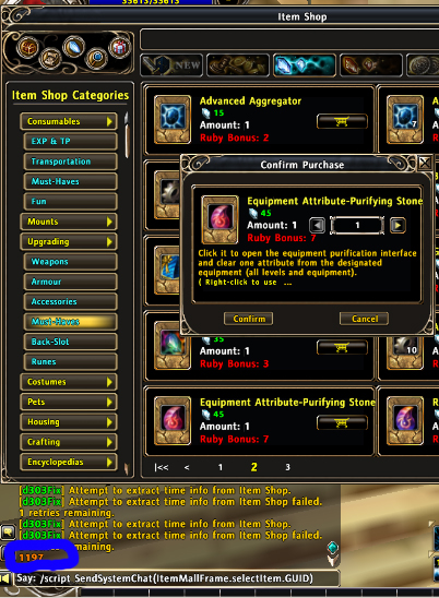 So I sometimes had a problem getting this function to work. It seems to have the issue when I have a static popup, most often the warning about unhealthy memory. It may be a good idea to look for and close the popups before purchasing from the item shop.
