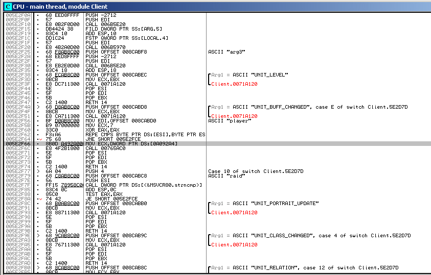 Ok now let's look at making patch transition easier. So lets make up a database of sections of memory that give us the addresses we want. Easiest way to do this is with Ollydbg. The great thing about Olly is you don't need to actually start the client (game) in order to use Olly. So if you have an old version of the game you can search it's memory without starting it, as starting client will no doubt make it patch to latest version.
