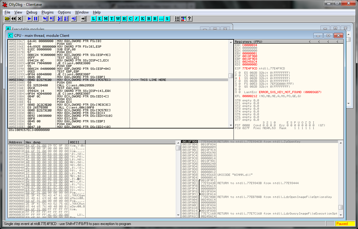 After a short amount of time, the target program should be loaded into Olly. You should see several windows containing a bunch of gibberish. This means you (hopefully) did something right. Under 64-bit OSes, 32-bit applications are not run directly, but through a compatibility layer of sorts. This means we need to be aware that Olly will not automatically select the proper module, but rather, the wrapper. If you do not already have the Executable modules window showing in Olly, press ALT-E or go to View->Executable modules. In this window, check the list for the target application again. In our example, we look for Program Files (x86)/Runes of Magic/Client.exe. When you find it, double-click it. The CPU (main thread) window should now jump to the foreground.