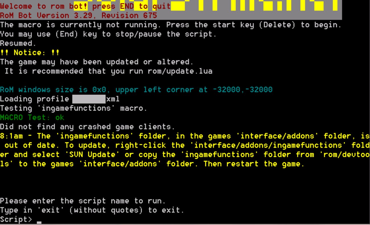 2.) Replaced the "Ingamefunctions" folder (in the "C:/.../Runes of Magic/Interface/Addons" folder) with the now updated "Ingamefunctions" folder (from the "C:/.../micromacro/script/rom/devtools" folder).