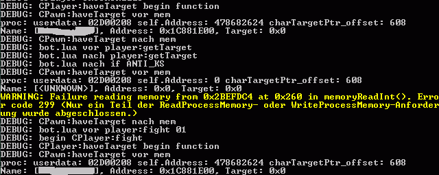 and run the bot again. It should help tell you which object the error is in (if it's in CPlayer, then you know it's a problem with the player, if it's a CPawn with your target's name, then this tells you that it's a problem with reading information from your target).