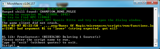 I am nearly unable to do anything with the bot since the last revision too. Every script crashes with different errors. Scripts, which didn't crash before. The lower error while leveling weapon, different errors when completing quests. Loginnextchar userfunction errors sometimes when relogging, which it never did. The ingamefunction addon is not installed or, the test macro didn't work (both errors). I should start writing down all errors, or just use the old revision :D