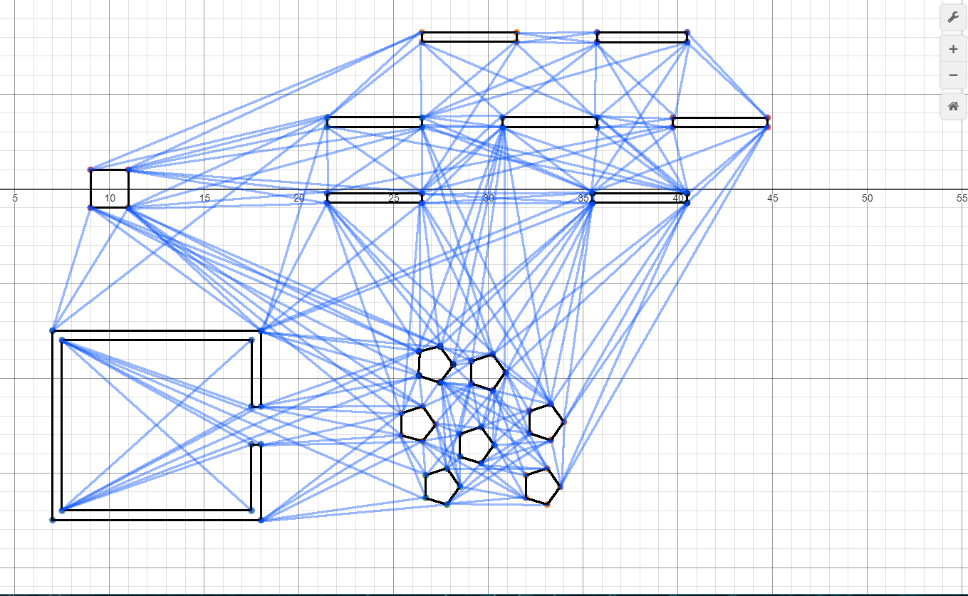 We can now connect each point in each polygon to every other point in which it has visibility (does not cross inside of another polygon). This will create tons of connections between points, and may look like this: Each "connection" then represents a pathway between points that can be considered collision-free; basically it means we can walk down this line to get to that point. If there's a point we don't specifically have vision to, we can instead opt to bounce to another connection until we get around the obstacle. But we're getting ahead of ourselves. Anyways, this collection of polygons & connections will be known as a "PolyGrid" from here on out.