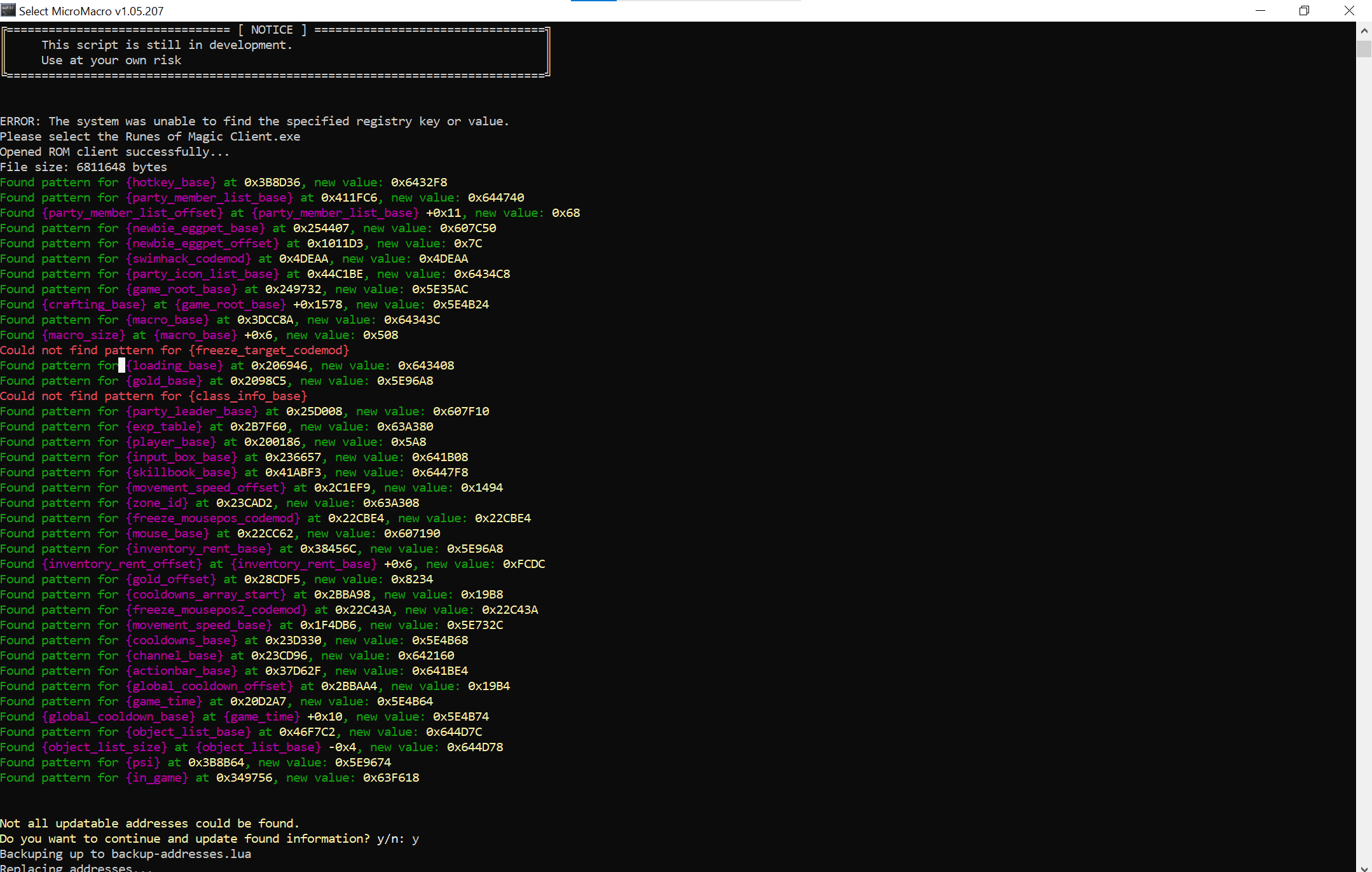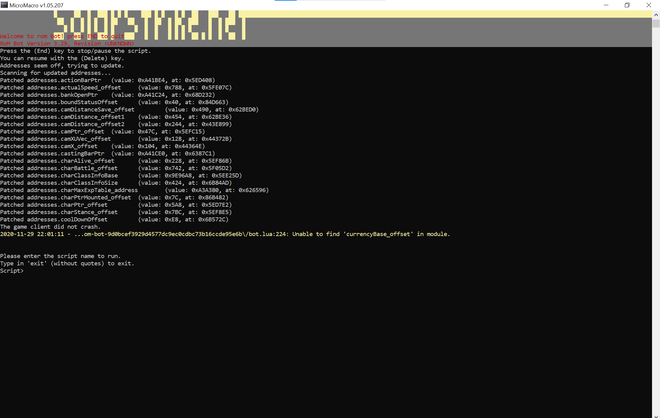 im palying private server and it is version 7.4.0.2917.en ....but rom bot not working on it see the picture error i have used multiple micromacro version stell same error